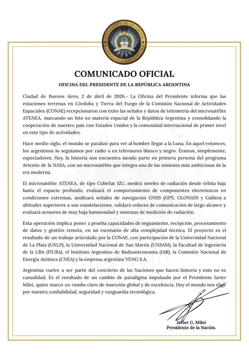 El Gobierno nacional confirmó que la Argentina logró recepcionar con éxito datos y telemetría del microsatélite ATENEA, en el marco del programa internacional Artemis impulsado por la NASA.