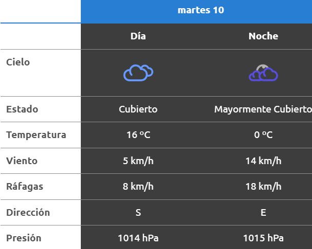 Para después del mediodía el cielo estará algo nublado y los vientos del sector norte tendrán velocidades estimadas entre 23 y 31 km/h. La temperatura pronosticada sería de 16 grados.