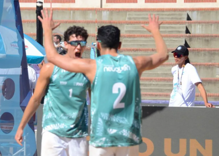 En el mismo predio, la dupla neuquina Fausto Inostroza y Leonel Pintos se metió en la final por el oro tras vencer en semifinales a los santafesinos Juan De Serchio e Isaac Osatinsky. El partido se definió en tie break: tras perder el primer set 22-20, los neuquinos ganaron el segundo 21-1 y el alargue 15-11.