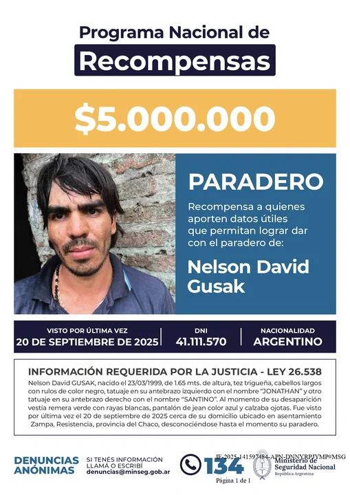 El Ministerio de Seguridad Nacional ofreció una recompensa de $5 millones para obtener información que permita dar con el paradero de Nelson David Gusak, un joven desaparecido desde septiembre de 2025 en la provincia de Chaco.