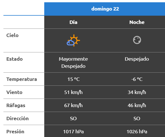 El parte del servicio meteorológico prevé que para después del mediodía el cielo estará ventoso y los vientos del sector sudoeste tendrán velocidades estimadas de entre 32 y 41 km/h. La temperatura pronosticada sería de 11 grados.