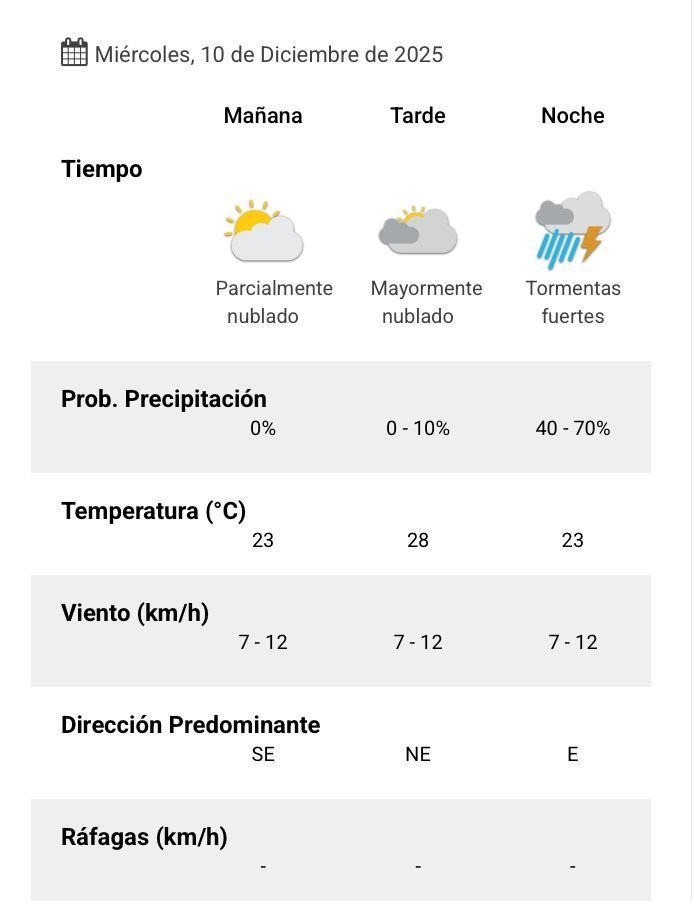 El parte del servicio meteorológico prevé que para después del mediodía el cielo estará parcialmente nublado y los vientos del sector noreste tendrán velocidades estimadas entre 7 y 12 km/h. La temperatura pronosticada sería de 28 grados.