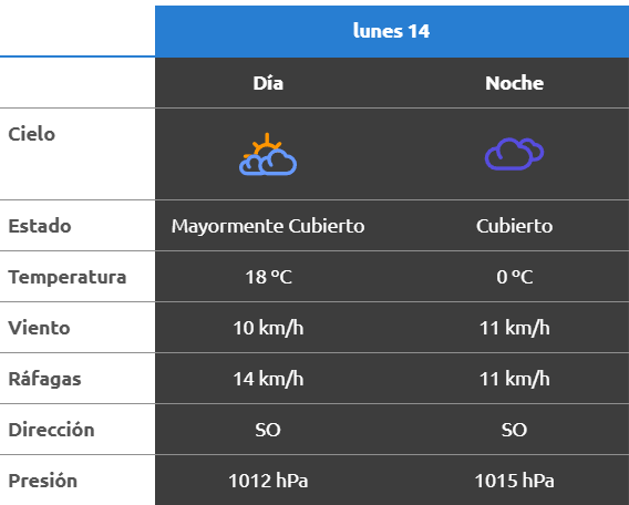 El parte del servicio meteorológico prevé que para después del mediodía el cielo estará parcialmente nublado y los vientos del sector oeste tendrán velocidades estimadas entre 7 y 12 km/h. La temperatura pronosticada sería de 13 grados.