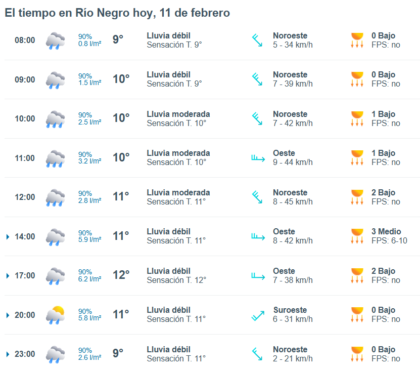 El pronóstico del tiempo para la ciudad de Río Negro, indica que hoy 11 de febrero el cielo estará con lluvias fuertes por la mañana y la temperatura rondará entre 1 grados.