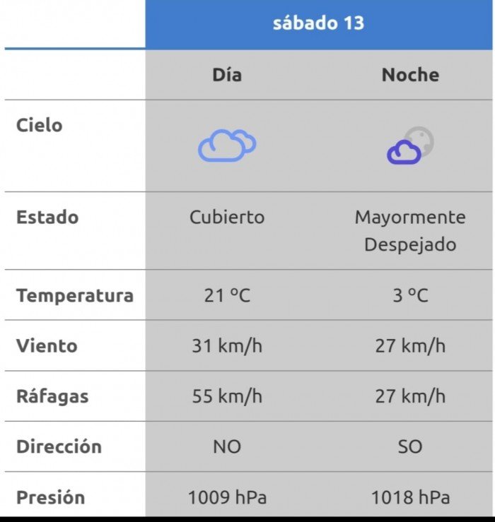 Después del mediodía el cielo estará mayormente nublado y los vientos del sector sudoeste tendrán velocidades estimadas de entre 32 y 41 km/h. La temperatura pronosticada sería de 20 grados. A la noche, el clima rondará los 13 grados, mientras que los vientos serán del oeste y correrán a una velocidad de entre 23 y 31 kilómetros por hora. La probabilidad de lluvia estaría en el orden del por ciento para esta franja del día.