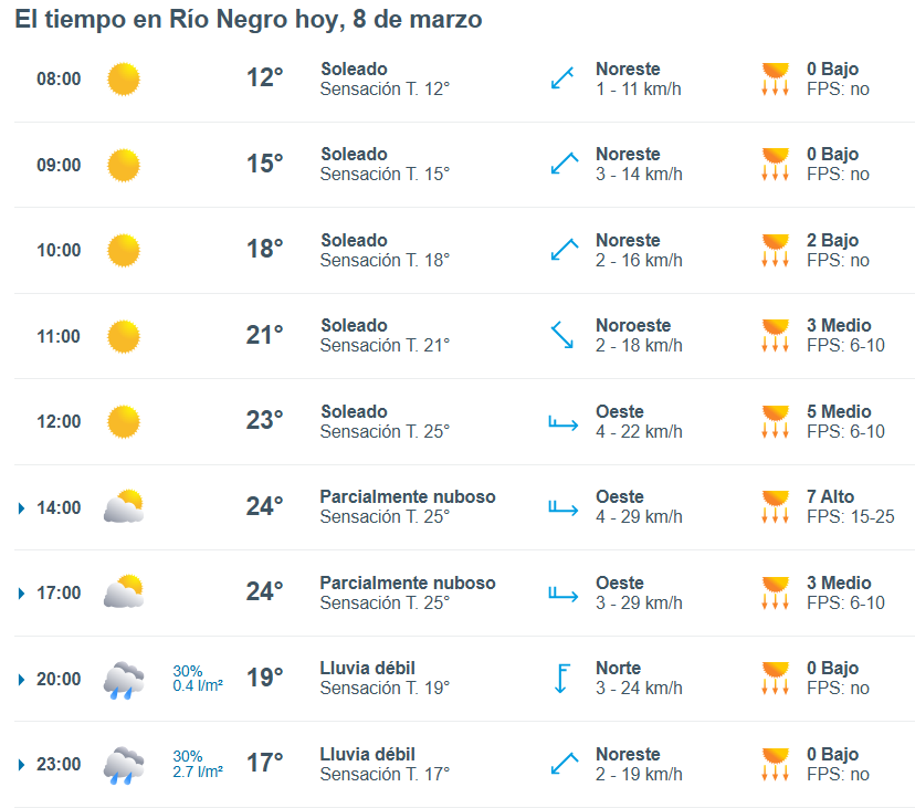 El pronóstico del tiempo para la ciudad de Río Negro, indica que hoy 8 de marzo el cielo estará mayormente nublado por la mañana y la temperatura rondará entre 12 grados.