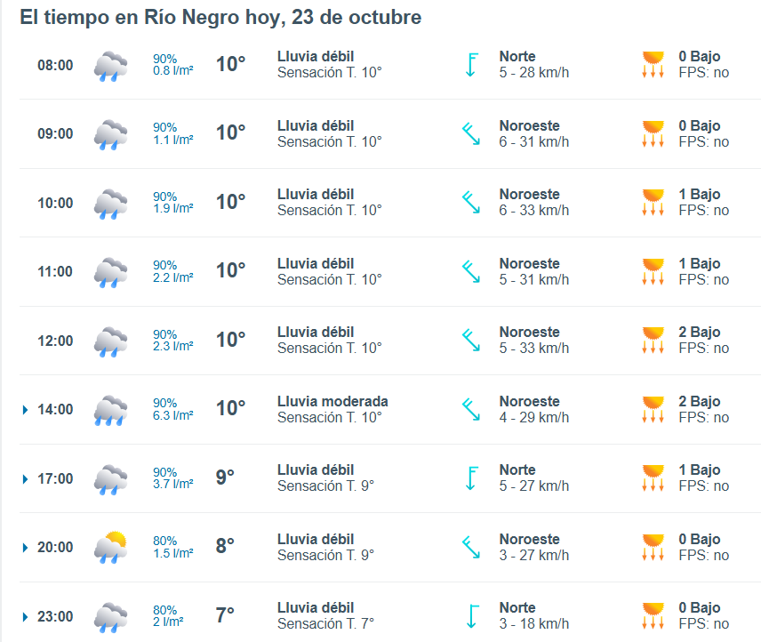 El pronóstico del tiempo para la ciudad de Viedma , indica que hoy 23 de octubre el cielo estará con lluvias aisladas por la mañana y la temperatura rondará entre 13 grados.