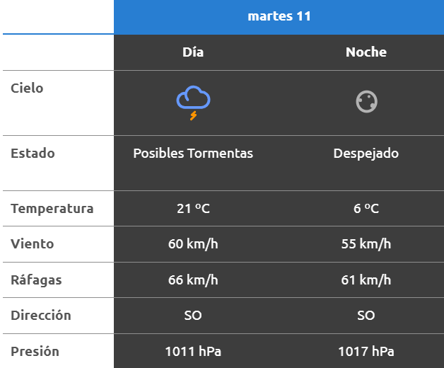 El parte del servicio meteorológico prevé que para después del mediodía el cielo estará con chaparrones y los vientos del sector sudoeste tendrán velocidades estimadas entre 32 y 41 km/h. La temperatura pronosticada sería de 21 grados.