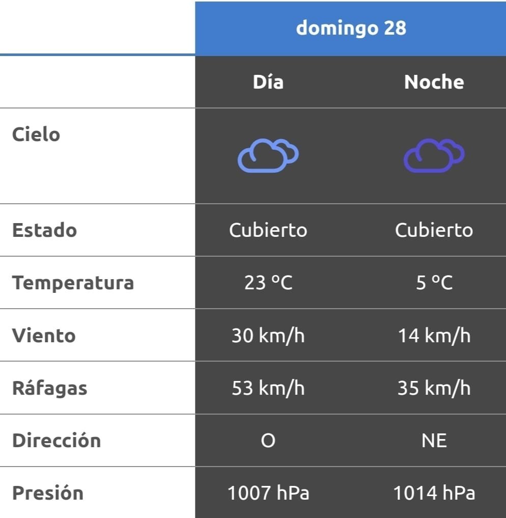 El parte del servicio meteorológico prevé que para después del mediodía el cielo estará parcialmente nublado y los vientos del sector noreste tendrán velocidades estimadas de entre 23 y 31 km/h. La temperatura pronosticada sería de 20 grados.