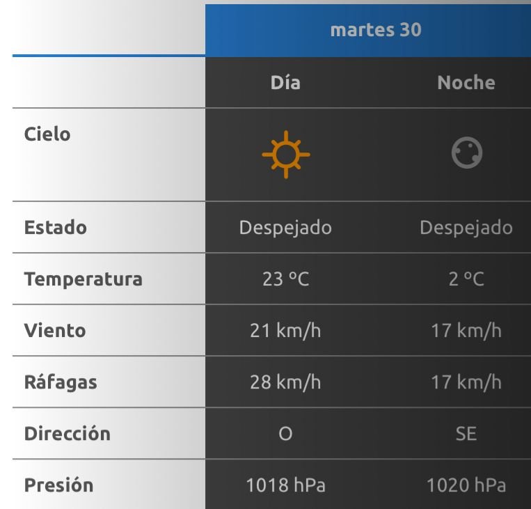 A la noche, el clima rondará los 17 grados, mientras que los vientos serán del sudoeste y soplaran a una velocidad de 23 y 31 kilómetros por hora. La probabilidad de lluvia estaría en el orden del por ciento para esta franja del día.