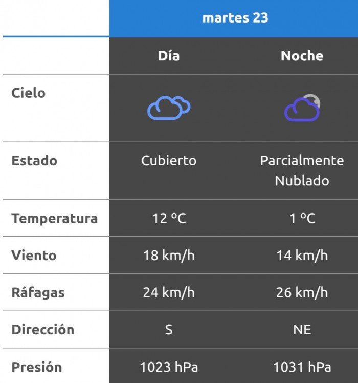 Durante la tarde el cielo estará parcialmente nublado y los vientos del sector noroeste tendrán velocidades estimadas de entre 13 y 22 km/h. La temperatura pronosticada sería de 12 grados. A la noche, el clima rondará los 6 grados, mientras que los vientos serán del norte y correrán a una velocidad de entre 7 y 12 kilómetros por hora. La probabilidad de lluvia estaría en el orden del por ciento para esta franja del día.