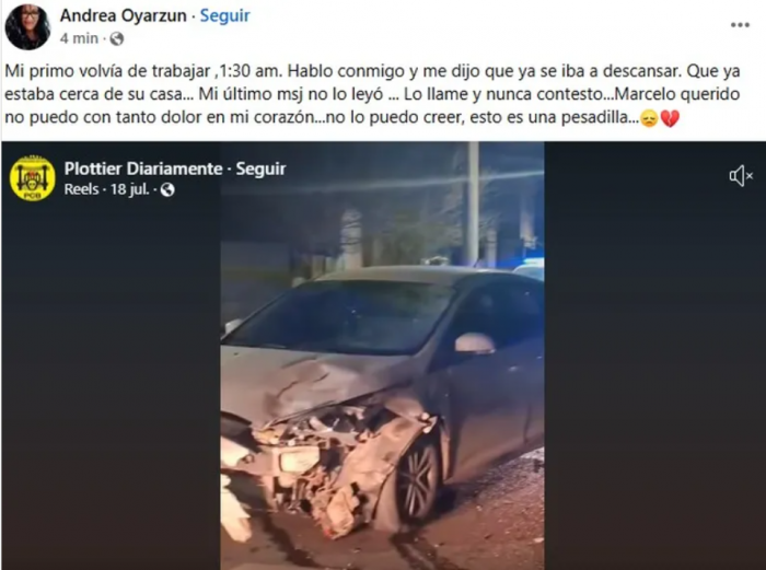 “Mi primo volvía de trabajar a la 1:30. Habló conmigo y me dijo que ya se iba a descansar, que estaba cerca de su casa. Mi último mensaje no lo leyó… Marcelo querido, no puedo con tanto dolor en el corazón”, escribió una prima en un emotivo posteo en Facebook.