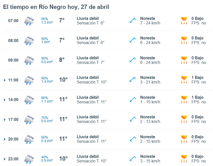 El pronóstico del tiempo para la ciudad de Río Negro, indica que hoy 27 de abril el cielo estará con lluvias por la mañana y la temperatura rondará entre 7 grados.