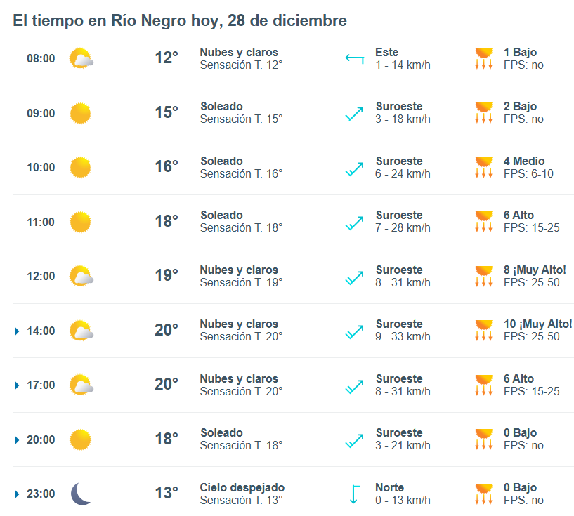 El pronóstico del tiempo para la ciudad de Río Negro, indica que hoy 28 de diciembre el cielo estará despejado por la mañana y la temperatura rondará entre 10 grados.