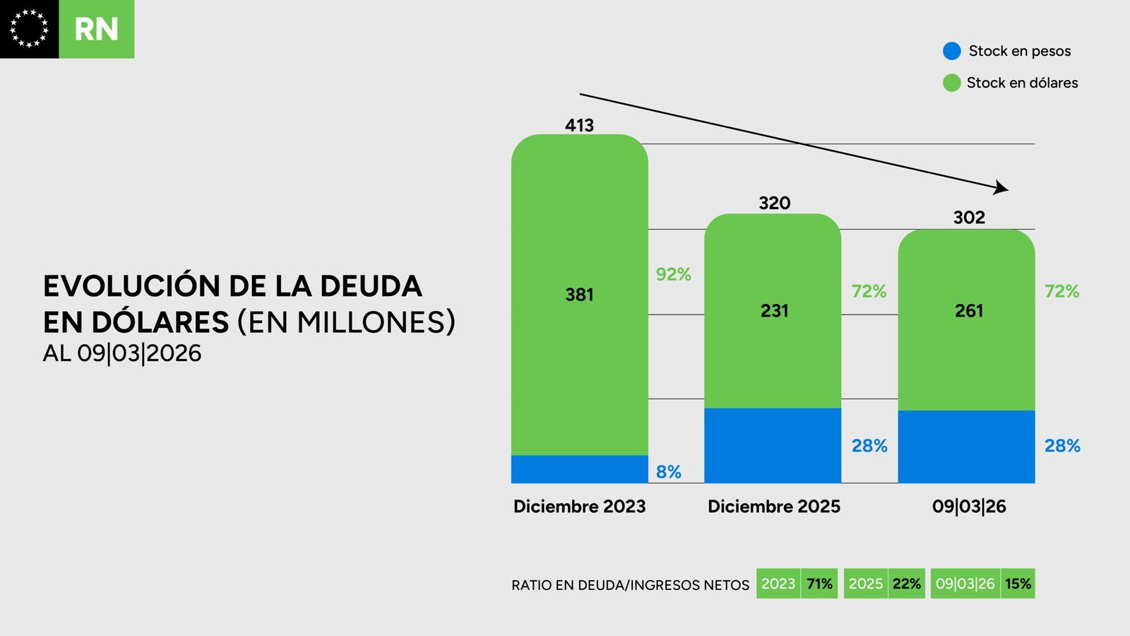 En paralelo, el peso de la deuda sobre los ingresos corrientes de la provincia también mostró una fuerte caída: pasó del 71% al 15%, lo que representa una mejora del 79% en los indicadores de sostenibilidad fiscal.
