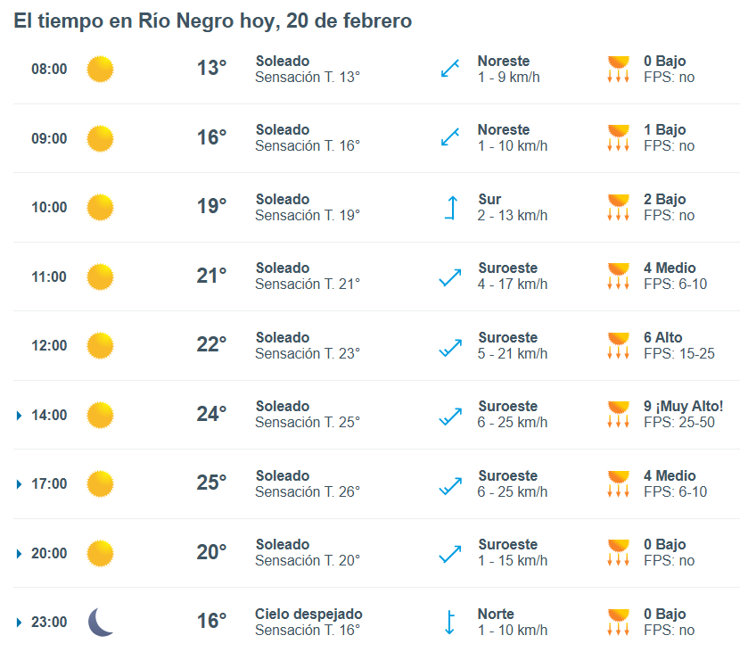 El pronóstico del tiempo para la ciudad de Río Negro, indica que hoy 20 de febrero el cielo estará parcialmente nublado por la mañana y la temperatura rondará entre 16 grados.