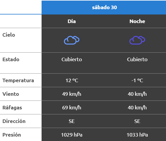 El parte del servicio meteorológico prevé que para después del mediodía el cielo estará con lluvias fuertes y los vientos del sector sur tendrán velocidades estimadas de entre 23 y 31 km/h. La temperatura pronosticada sería de 11 grados.