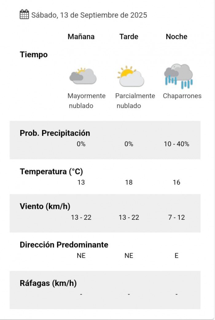 El parte del servicio meteorológico prevé que para después del mediodía el cielo estará parcialmente nublado y los vientos del sector noreste tendrán velocidades estimadas entre 13 y 22 km/h. La temperatura pronosticada sería de 18 grados.