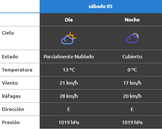 El parte del servicio meteorológico prevé que para después del mediodía el cielo estará parcialmente nublado y los vientos del sector noroeste tendrán velocidades estimadas de entre 23 y 31 km/h. La temperatura pronosticada sería de 10 grados.