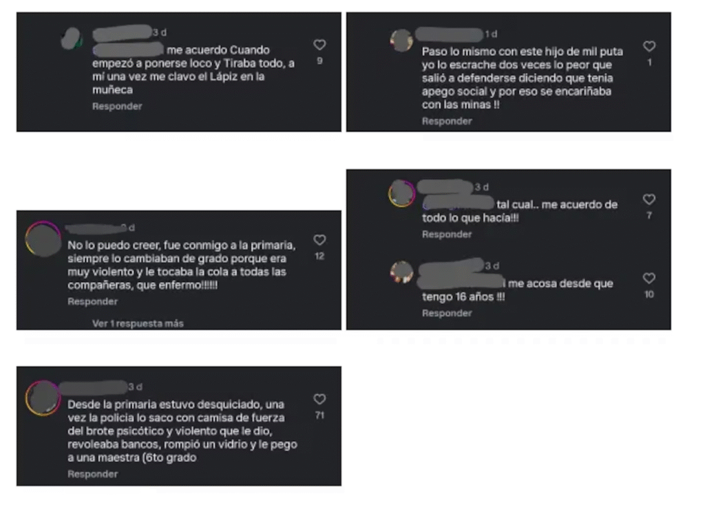 Según una recopilación realizada por el medio local Villa María Ya!, los testimonios incluyen episodios de extrema gravedad. Una mujer denunció que Mulinetti “le clavó un lápiz en la muñeca”, mientras que otra recordó que “desde la primaria estuvo desquiciado” y que en una ocasión “la Policía lo sacó a la fuerza del aula porque revoleaba los bancos y rompió un vidrio”. También se mencionaron hechos de violencia contra una docente y destrozos dentro del establecimiento educativo.