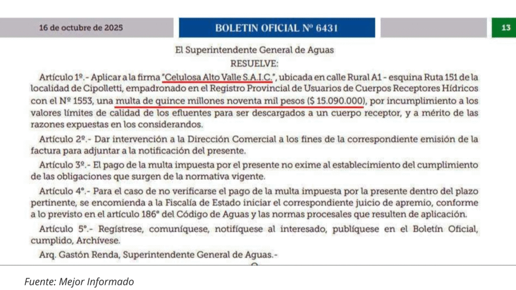El Departamento Provincial de Aguas (DPA) sancionó con una multa de 15 millones de pesos a la empresa Celulosa Alto Valle, tras constatar que arrojó efluentes industriales contaminantes al Canal de los Milicos, en Cipolletti. La decisión fue publicada esta semana en el Boletín Oficial y, de no abonarse en tiempo y forma, el organismo ya instruyó a la Fiscalía para avanzar con el cobro judicial de la deuda.