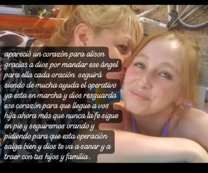 Este lunes, su madre, Carina, compartió con emoción dos noticias que trajeron algo de alivio: Alison abrió los ojos y apareció un corazón compatible. La cirugía está programada para este martes a las 7 de la mañana en el Hospital Italiano de Buenos Aires, donde se encuentra internada desde el viernes pasado.