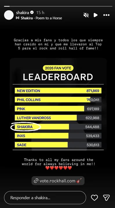 A través de sus redes sociales, Shakira agradeció el apoyo de sus seguidores, quienes impulsaron su posicionamiento en el ranking y reforzaron su presencia entre los candidatos con mayores posibilidades de avanzar.