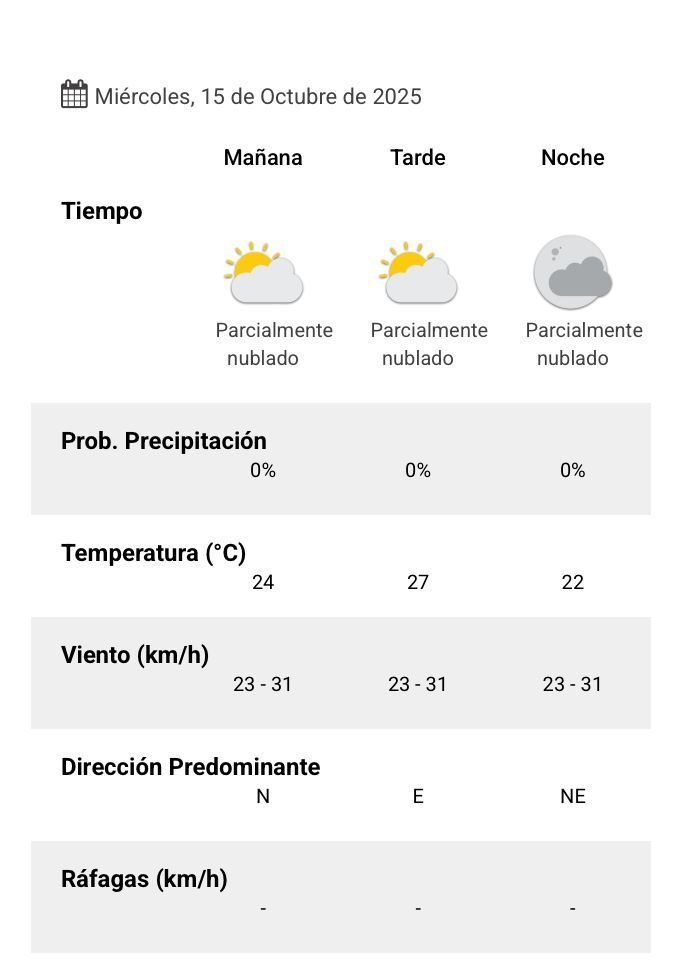 El parte del servicio meteorológico prevé que para después del mediodía el cielo estará parcialmente nublado y los vientos del sector este tendrán velocidades estimadas entre 23 y 31 km/h. La temperatura pronosticada sería de 26 grados.