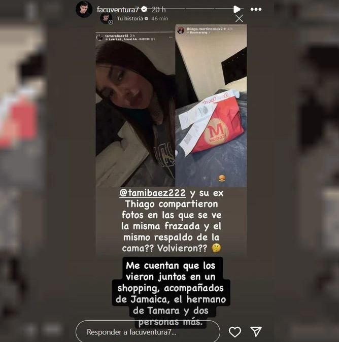 “¿Tamara Báez y su ex Thiago Martínez compartieron fotos en las que se ve la misma frazada y el mismo respaldo de la cama? ¿Volvieron?”, se preguntó Ventura en una historia de Instagram. Poco después, aseguró haber recibido información que confirmaría el acercamiento.