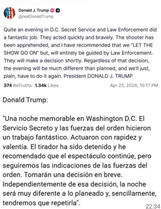 El incidente ocurrió poco después del inicio de la tradicional gala, que reúne a periodistas, funcionarios y legisladores en uno de los encuentros más importantes del calendario político estadounidense. Por el momento, no se precisó el origen de los estallidos ni mayores detalles sobre el detenido.