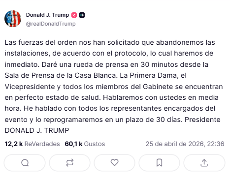 El presidente de Estados Unidos, Donald Trump, fue evacuado este sábado por la noche de la cena anual de la Asociación de Corresponsales de la Casa Blanca tras un incidente de seguridad ocurrido en Washington. El mandatario resultó ileso.