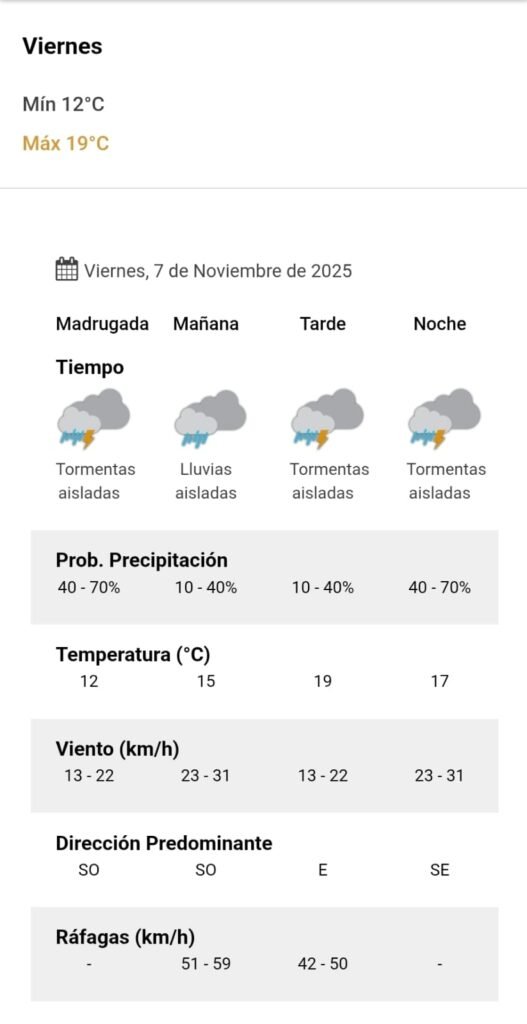 A la noche, el clima rondará los 17 grados, mientras que los vientos serán del sudeste y correrán a una velocidad de entre 23 y 31 kilómetros por hora. La probabilidad de lluvia estaría en el orden de entre 40 y 70 por ciento para esta franja del día.
