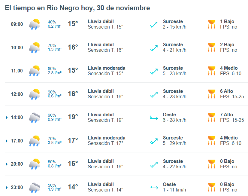 El pronóstico del tiempo para la ciudad de Río Negro, indica que hoy 30 de noviembre el cielo estará con tormentas aisladas por la mañana y la temperatura rondará entre 13 grados.
