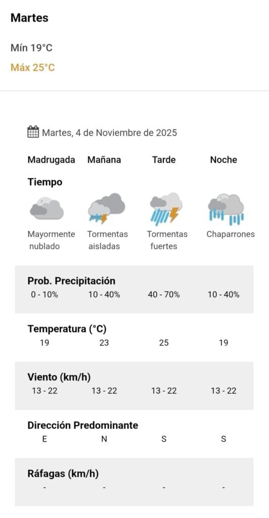 El parte del servicio meteorológico prevé que para después del mediodía el cielo estará con tormentas fuertes y los vientos del sector sur tendrán velocidades estimadas de entre 13 y 22 km/h. La temperatura pronosticada sería de 25 grados.
