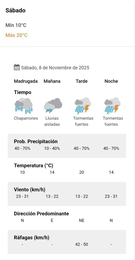De acuerdo al parte del Servicio Meteorológico Nacional, el clima presenta una probabilidad de lluvia del 10 y 40 por ciento, y los vientos del este correrán a una velocidad de entre 13 y 22 kilómetros por hora. La humedad sería del 61 por ciento, y la visibilidad sería regular.