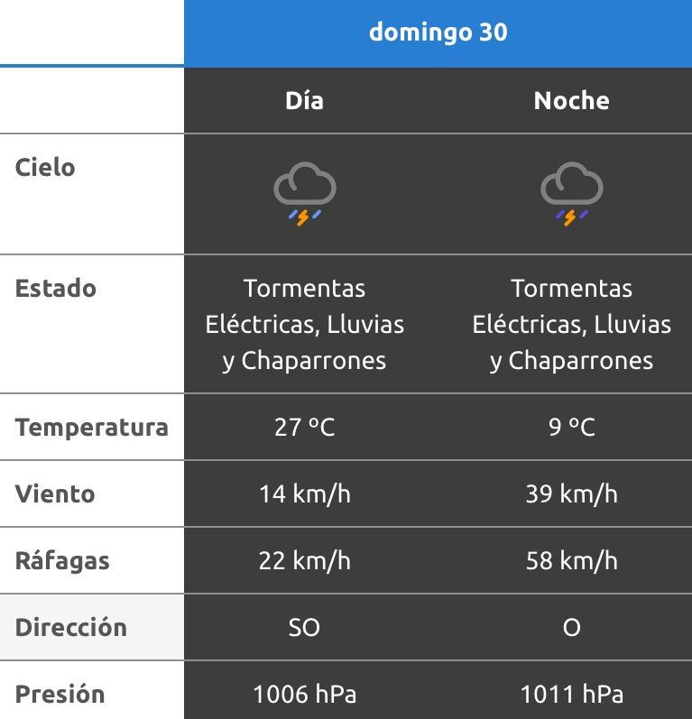 A la noche, el clima rondará los 20 grados, mientras que los vientos serán del sudoeste y soplarán a una velocidad de entre 32 y 41 kilómetros por hora. La probabilidad de lluvia estaría en el orden de entre el 40 y 70 por ciento para esta franja del día.