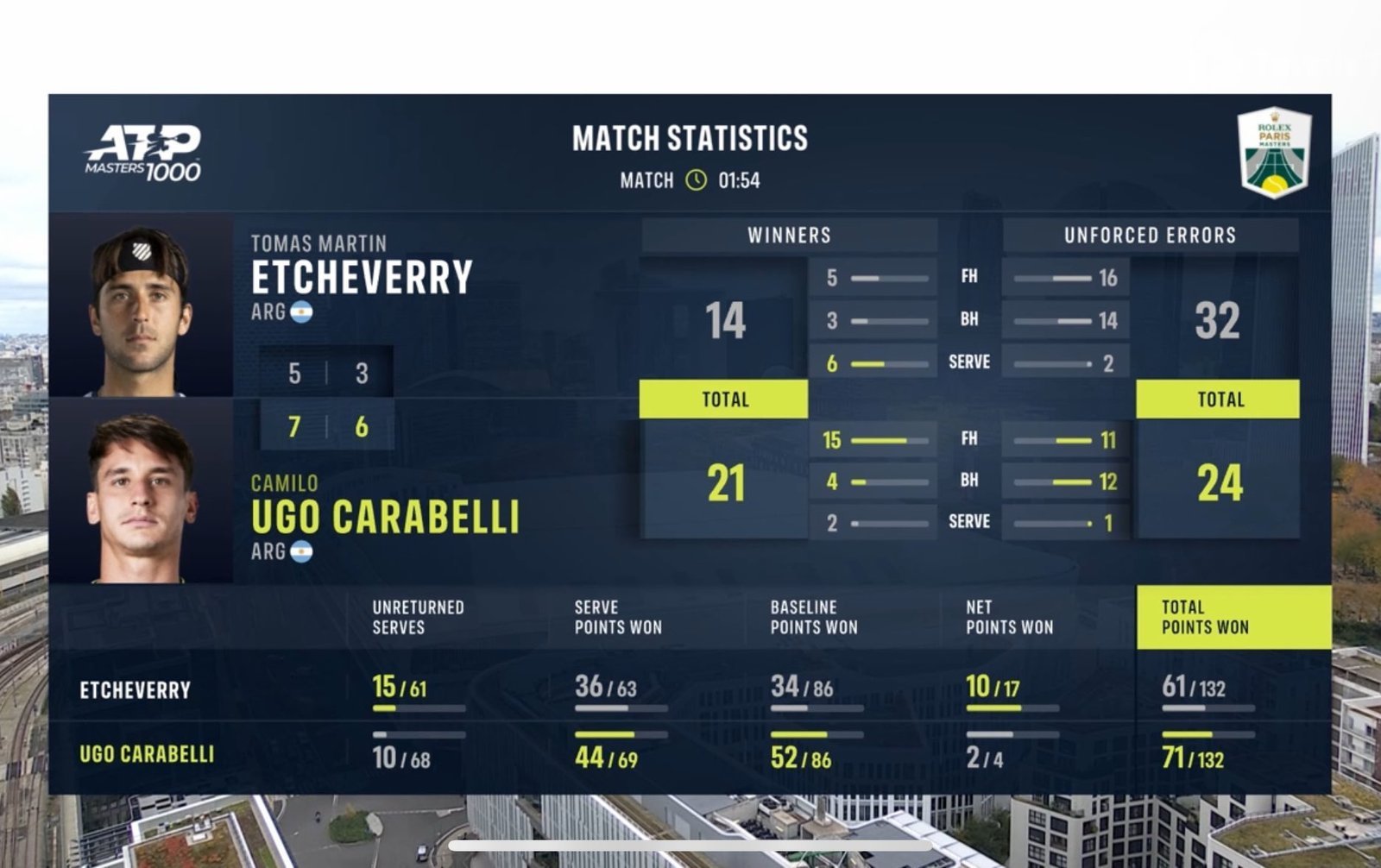 Etcheverry, en tanto, venía de superar la clasificación tras vencer en sets corridos al español Pedro Martínez y al neerlandés Jesper de Jong. A pesar de la derrota, el platense cierra la temporada con una destacada regularidad en sus actuaciones.
