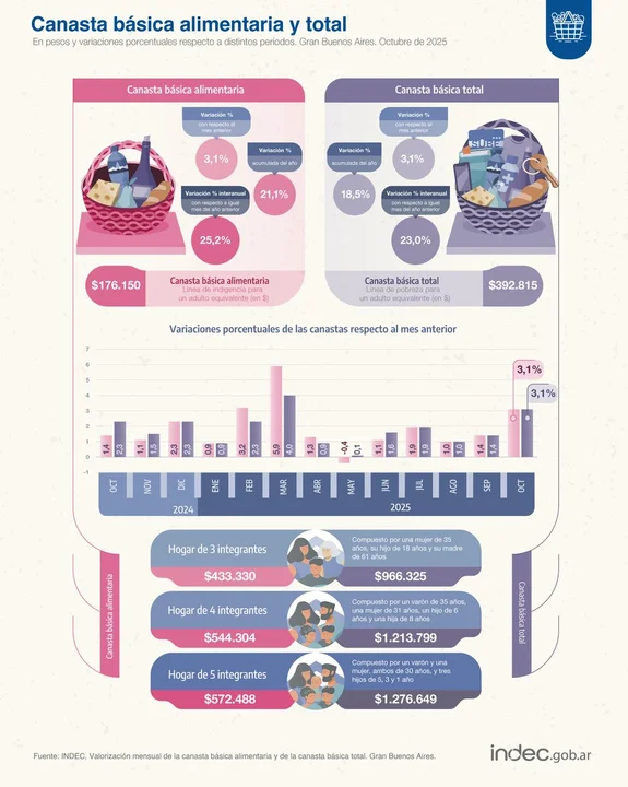 En lo que va del año, la CBA acumula un incremento del 21,1%, mientras que la CBT sube 18,5%. En comparación con octubre de 2024, los aumentos interanuales fueron del 25,2% y 23%, respectivamente.