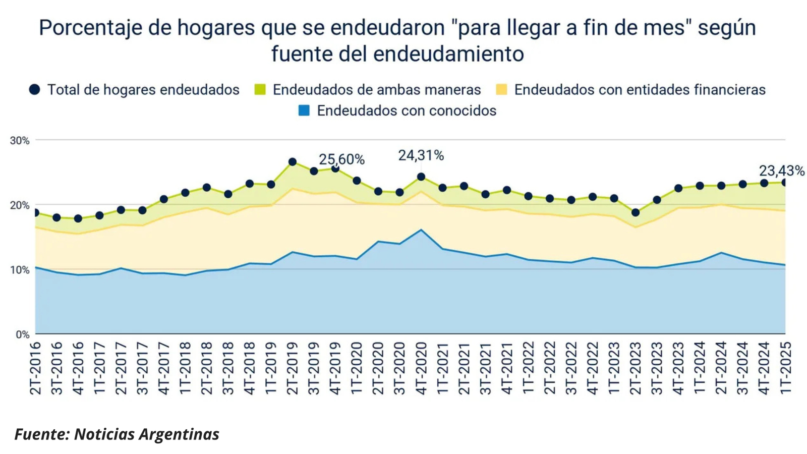 El 23,4% de los hogares argentinos se vio obligado a endeudarse para cubrir gastos básicos en el primer trimestre de 2025, según un informe del Instituto Argentina Grande (IAG) basado en datos de la Encuesta Permanente de Hogares (EPH). El dato refleja el creciente deterioro del poder adquisitivo de las familias y un cambio en la forma en que se financian, ya que cada vez más recurren al sistema financiero formal y, simultáneamente, a redes informales.