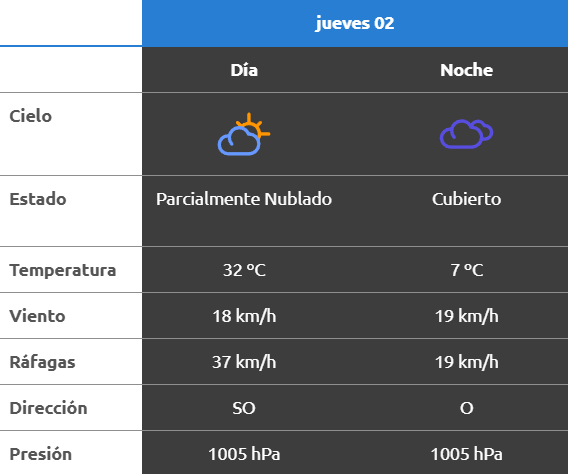 En Neuquén Capital, la madrugada comenzará con 16 grados, cielo parcialmente nublado y viento del Sur leve. Hacia la mañana, la temperatura descenderá a 10 grados, con ráfagas del Oeste que podrían rozar los 50 km/h. La tarde será más cálida, con 30 grados y viento moderado del Oeste, mientras que por la noche el termómetro marcará 25 grados, con viento del Noroeste y ráfagas persistentes.