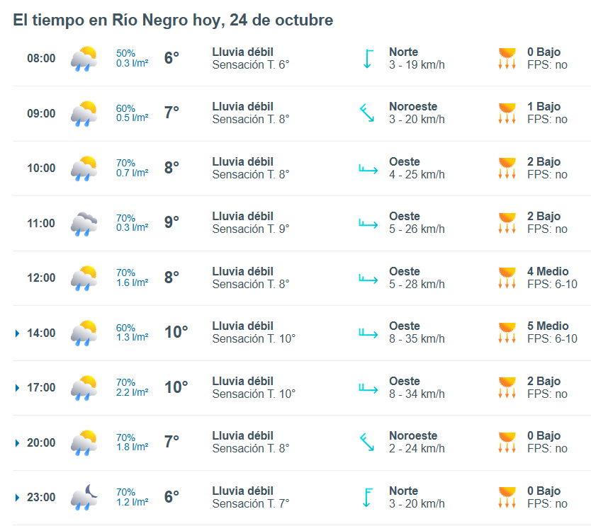 De acuerdo al parte del Servicio Meteorológico Nacional, el clima en esta ciudad de Río Negro se presentaría sin lluvias, y los vientos del sudoeste correrán a una velocidad de entre 32 y 41 kilómetros por hora. La humedad sería del 95 por ciento, y la visibilidad sería buena.