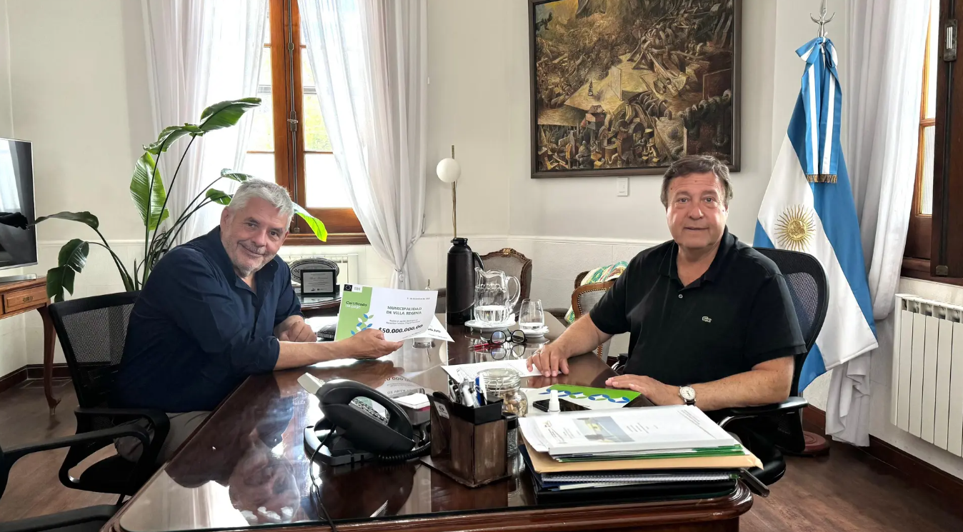 El Gobernador Alberto Weretilneck entregó al Intendente Luis Albrieu dos aportes provinciales para garantizar la continuidad de la obra pública en Villa Regina: $50 millones para el recambio del colector cloacal del sector suroeste y más de $44 millones para la restauración de la Escuela 52.