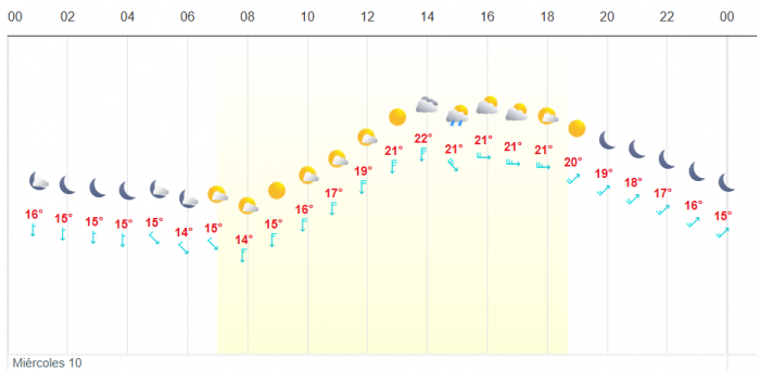 A la noche, el clima rondará los 17 grados, mientras que los vientos serán del sudoeste a una velocidad de 13 y 22 kilómetros por hora. La probabilidad de lluvia estaría en el orden del por ciento para esta franja del día.